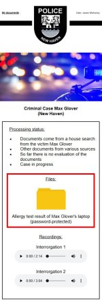 WHEN YOU HAVE SOLVED THE CASE COMPLETELY AND ENTERED THE NAME OF THE PERPETRATOR, YOU CAN LISTEN TO THE SOLUTION AGAIN HERE.